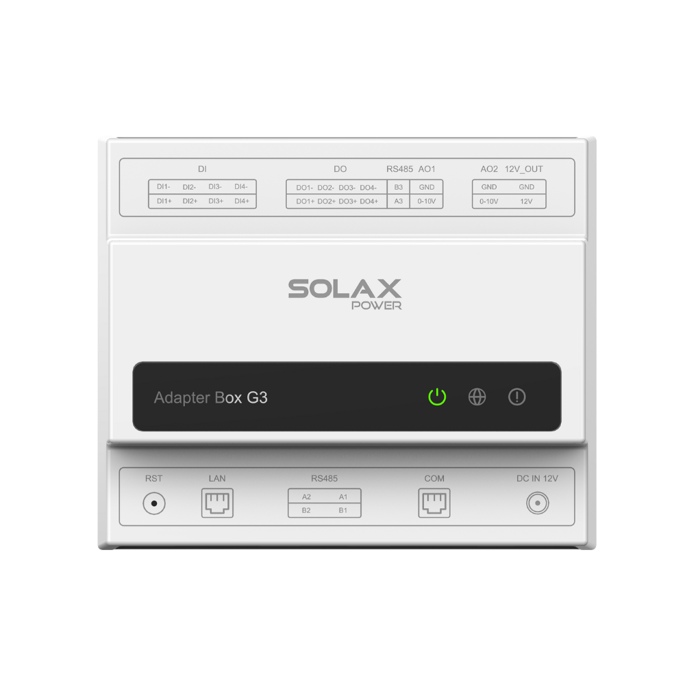 The SolaX Adapter BoX G3 is a compact smart load manager with DIN rail design for easy installation. It supports WiFi and LAN connectivity, external control access, and a clean layout suited for use.